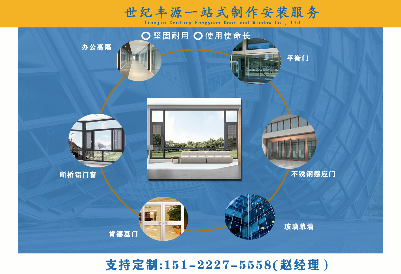 天津世紀豐源門窗有限公司從事斷橋鋁門窗,玻璃幕墻,平衡門,肯德基門,不銹鋼感應門,百葉窗,辦公高隔,制作安裝一站式訂制生產及配套服務等。 公司自成立以來,始終堅持以人才為本、誠信立業的經營原則,薈萃業界精英,成熟的技術、管理方法及企業經驗與國內企業的具體實際相結合,為企業供給各個方面的解決方案,使企業在激烈的市場競爭中始終堅持競爭力,實現企業快速、穩(wěn)定地發(fā)展。 質量好、服務好、才能信譽好,公司已在諸多領域取得輝煌成績,愿意成為您可信賴的長期合作伙伴?! ∽屛覀償y手同行,共同實現“讓普通老百姓都用得上高端門窗”...